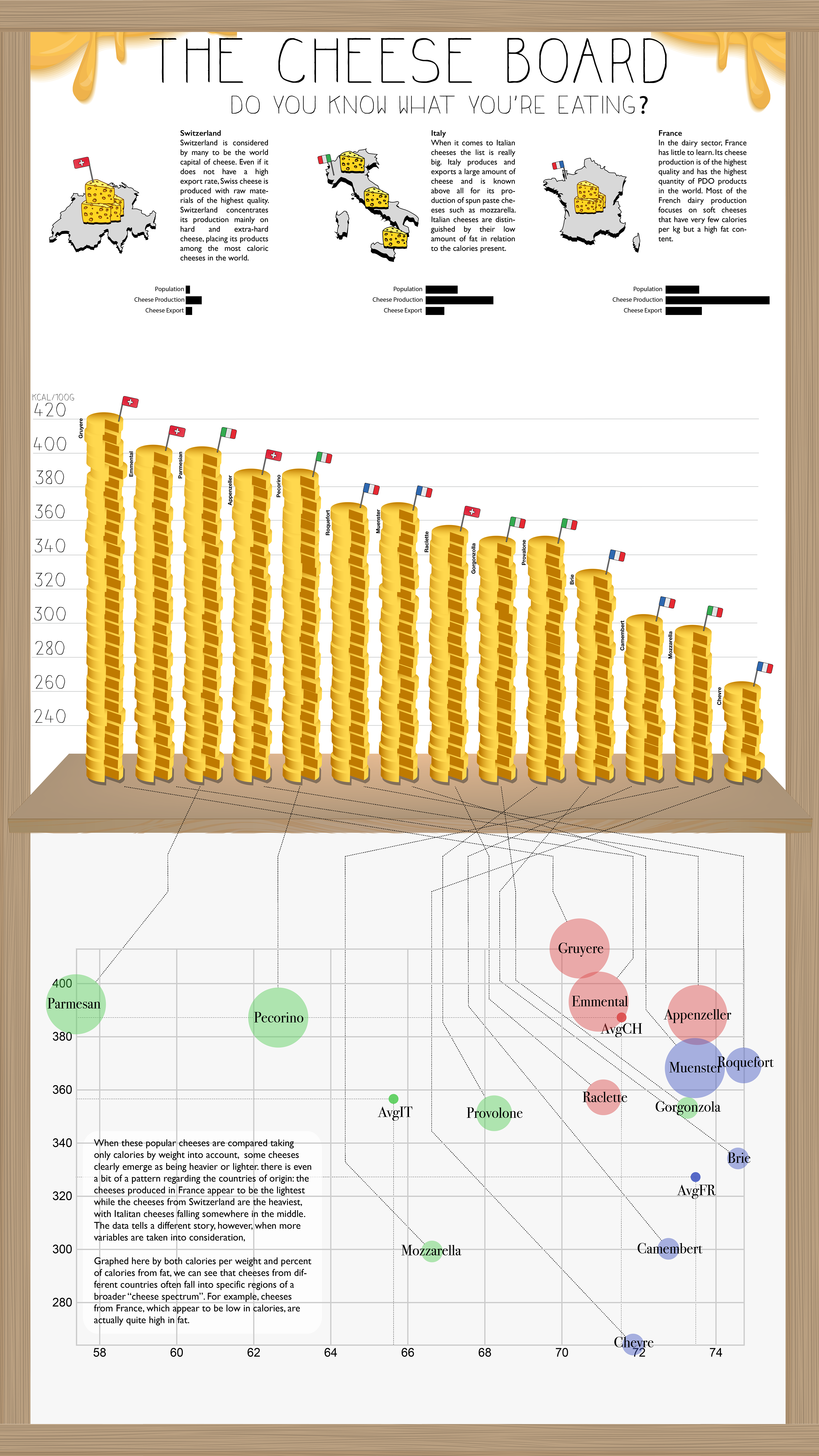Data visualization of the consumption and composition of cheeses produced in 3 of the main European producing countries: Italy, Switzerland and France.
